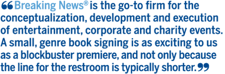 From having the right guests in the room to production, ticketing, seating and coordinating sponsorships/partnerships – Breaking News is extremely experienced at creating events on every scale. A small, genre book signing is as exciting to us as a blockbuster premiere, and not only because the line for the restroom is typically shorter.
